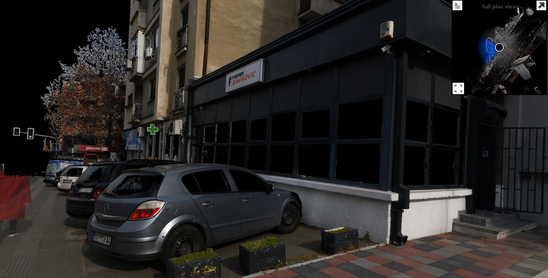 U kvalitet naših usluga ne želimo sumnjati. Zato posedujemo skener najnovije generacije koji omogućava da generišemo 3D snimke fasada, objekata, ulica i slično. Na slici je prikazan primer 3D snimaka naše kancelarije i okolnog prostora gde se mogu videti najsitniji detalji kao i visoka prostorna preciznost. Ovo nam sa sigurnošću omogućava da rešavamo različite inženjerske izazove i zadovoljimo sve kriterijume naših klijenata.